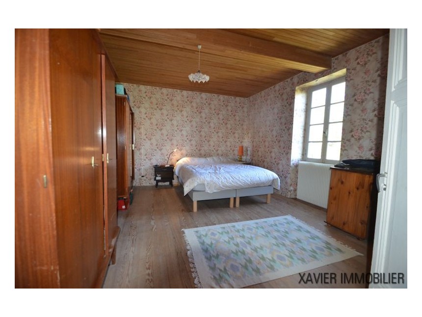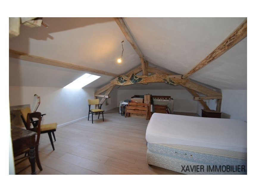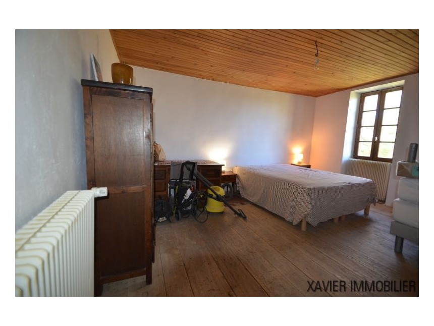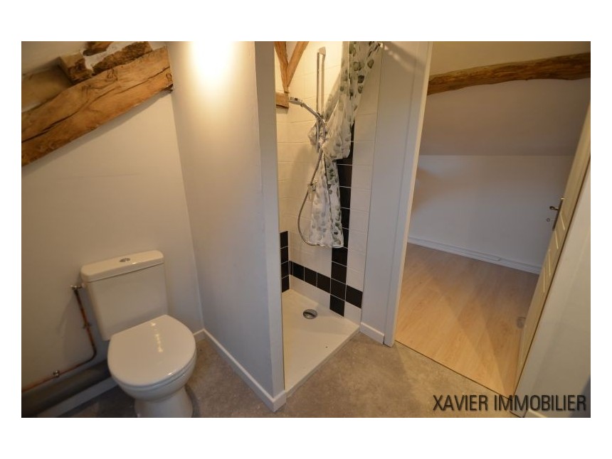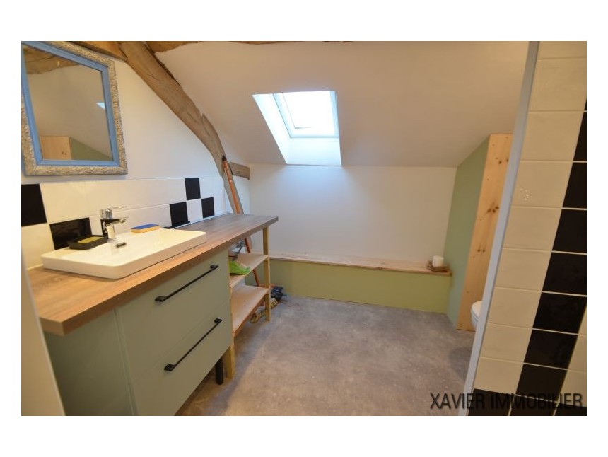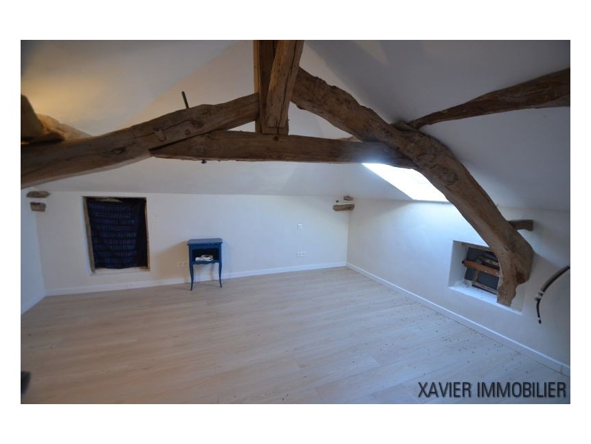 Depuis la cuisine, un escalier vous mène à l’étage avec une surface d’env. 90m² (30m² Loi Carrez) où un couloir donne accès à deux chambres et une salle d’eau sous combles. La toiture et l’isolation sont refaites.