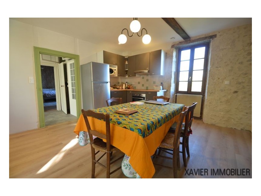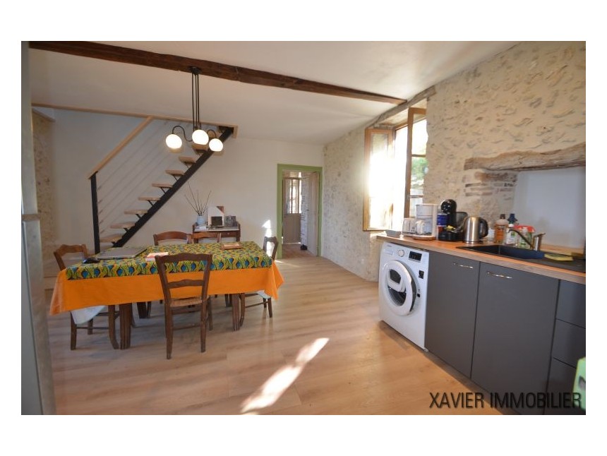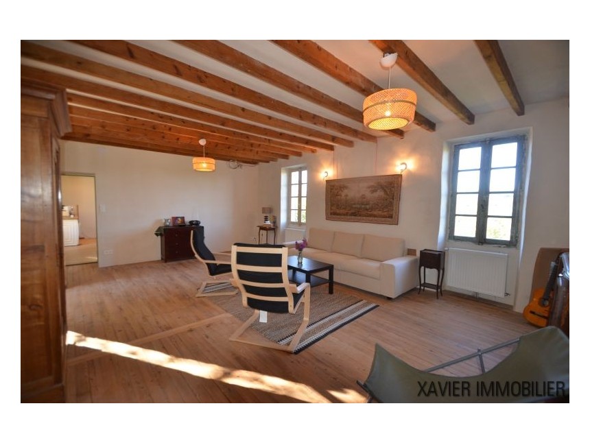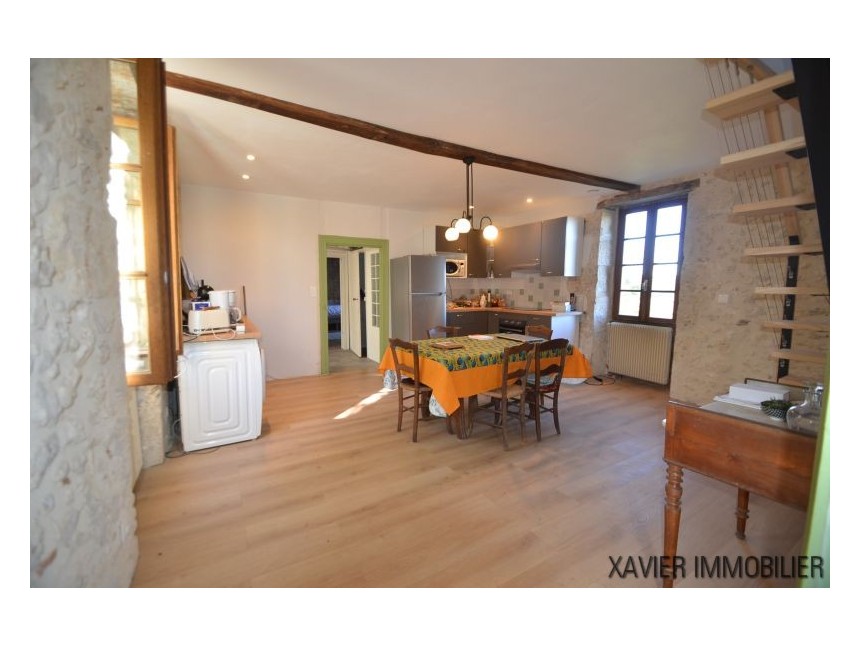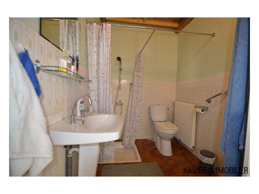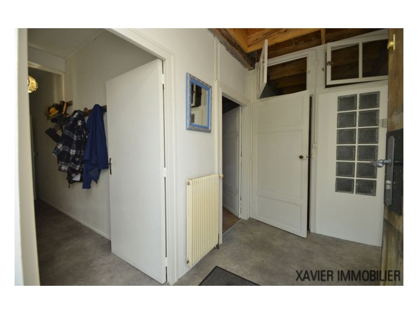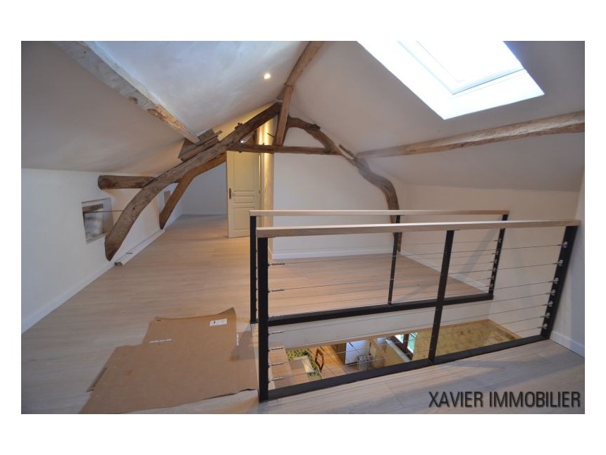 Depuis la cuisine, un escalier vous mène à l’étage avec une surface d’env. 90m² (30m² Loi Carrez) où un couloir donne accès à deux chambres et une salle d’eau sous combles. La toiture et l’isolation sont refaites.